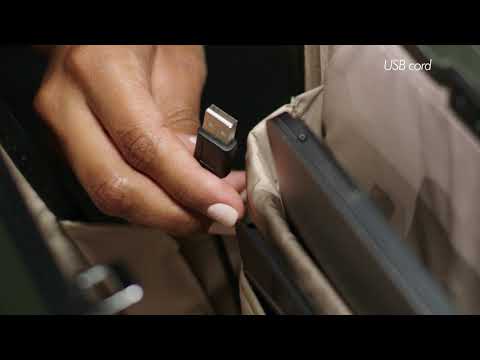 - Puerto USB externo en el costado de la bolsa se conecta a una batería separada almacenada en el bolsillo delantero, lo que le permite cargar cómodamente su teléfono u otro dispositivo desde fuera de la bolsa.